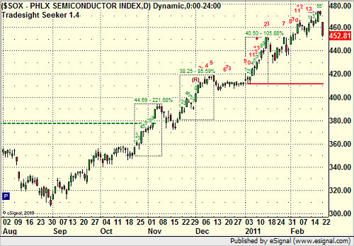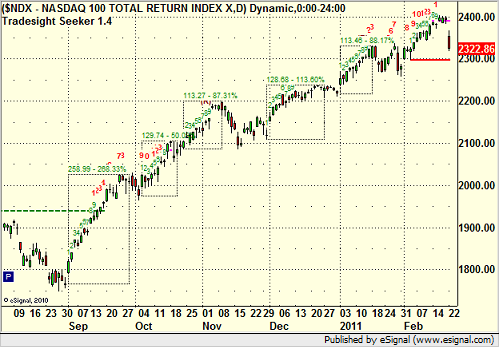 Which led to a gap down and further push lower (despite some recovery in the European markets before the US opened). NDX lost 70 on 2.2 billion NASDAQ shares and had 1940 more decliners than advancers: