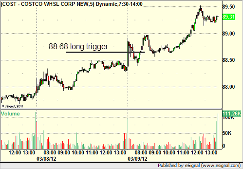 From the report, COST triggered long (without market support due to opening 5 minutes), didn’t work, worked later in the day on a retrigger: