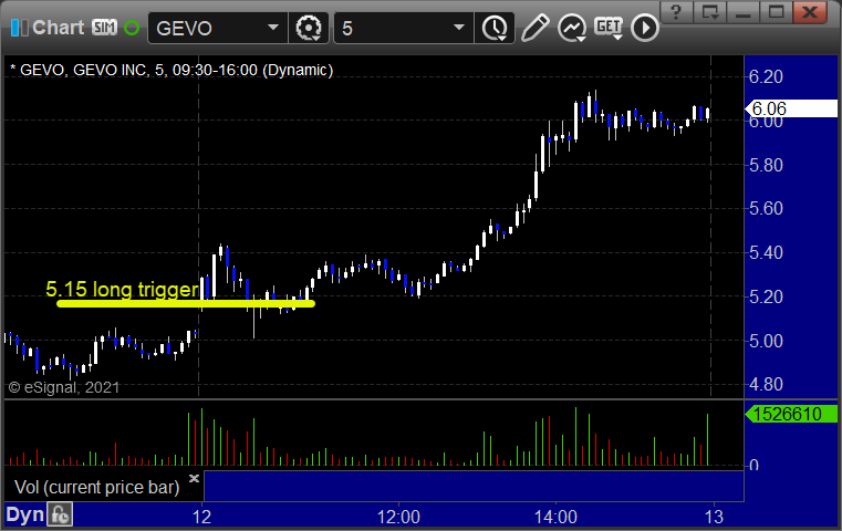 From the report, GEVO triggered long (without market support due to opening 5 minutes) and pulled back to fill the gap, and then worked, which we don’t count even though it worked perfectly: