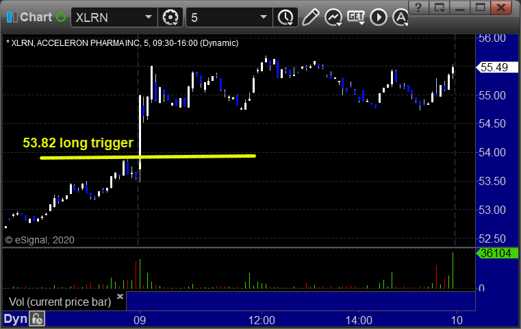 From the report, XLRN triggered long (without market support due to opening 5 minutes) and worked: