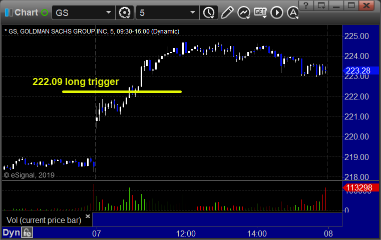With each stock’s recap, we will include a (with market support) or (without market support) tag, designating whether the trade triggered with or without market directional support at the time. Anything in the first five minutes will be considered WITHOUT market support because market direction cannot be determined that early. ETF calls do not require market support, and are thus either winners or losers.
