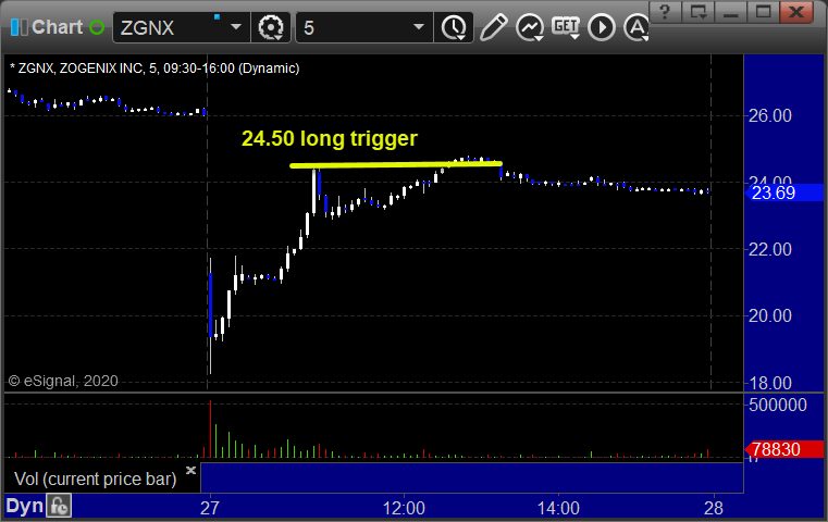 With each stock’s recap, we will include a (with market support) or (without market support) tag, designating whether the trade triggered with or without market directional support at the time. Anything in the first five minutes will be considered WITHOUT market support because market direction cannot be determined that early. ETF calls do not require market support, and are thus either winners or losers.