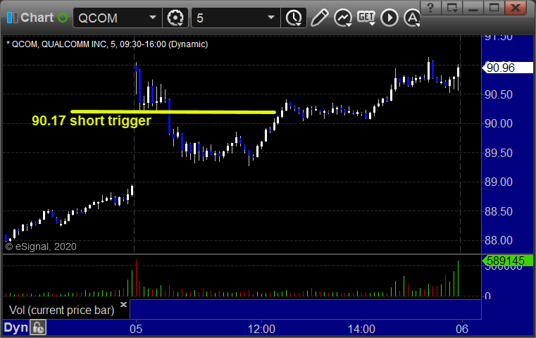 From the Messenger/Tradesight_st Twitter Feed, QCOM triggered short (with market support) and worked enough for a partial: