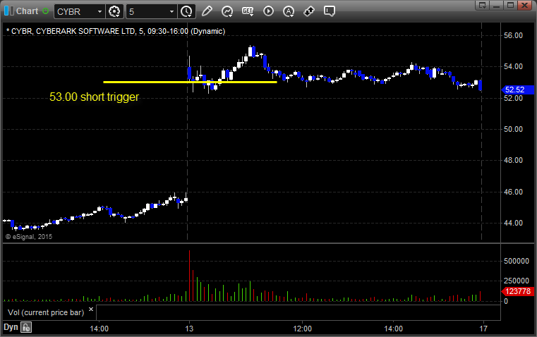 From the Messenger/Tradesight_st Twitter Feed, Rich’s CYBR triggered short (without market support) and worked enough for a partial: