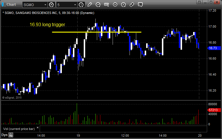 From the report, SGMO triggered long (with market support) and we closed it slightly in the money after nothing happened: