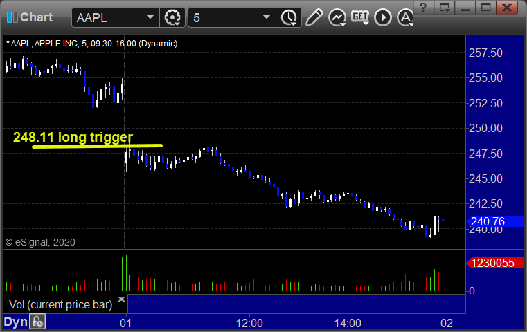 From the Messenger/Tradesight_st Twitter Feed, AAPL triggered long (with market support) and didn’t work, we kept it tight: