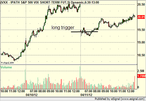 In the Messenger, Rich’s VXX triggered long over a 5-minute high (ETF, so no market support needed) after the second bar and worked: