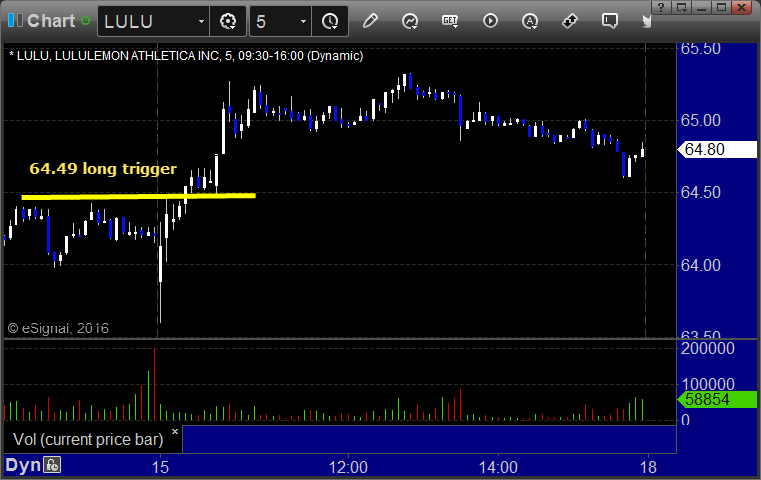 From the Messenger/Tradesight_st Twitter Feed, LULU triggered long (without market support) and worked: