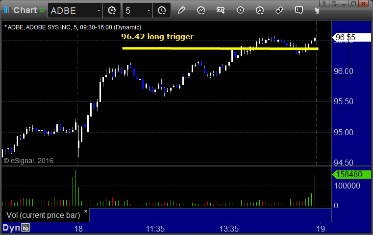 ADBE triggered long (with market support) and worked a little (I accidentally took it this morning at 95.42 instead of 96.42…which if you look at the 65-minute chart, there was a nice pattern there as well, but I had the wrong price flagged…oh well…lol):