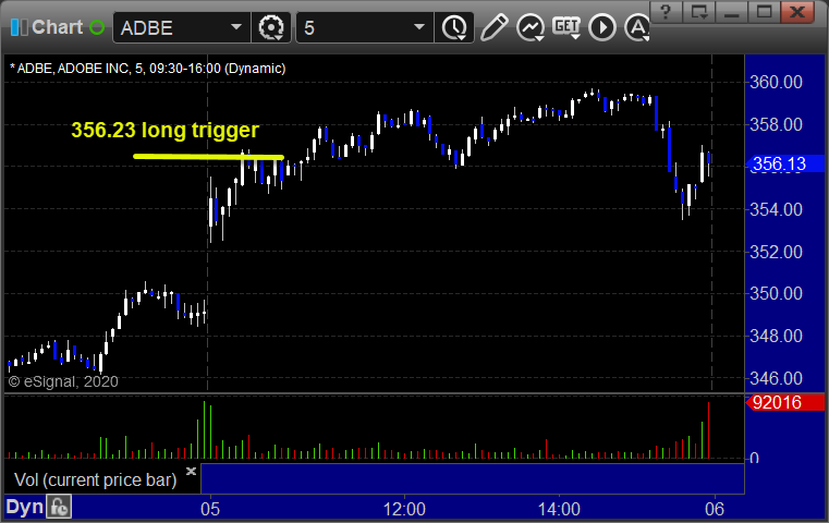 From the Messenger/Tradesight_st Twitter Feed, ADBE triggered long (with market support) and worked: