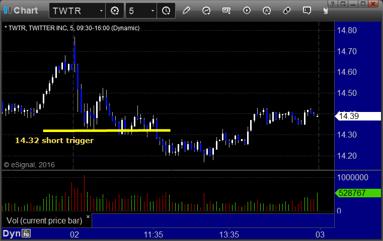 TWTR triggered short (without market support) and literally sat in the money by a dime or less for hours, which isn’t enough to count anyway:
