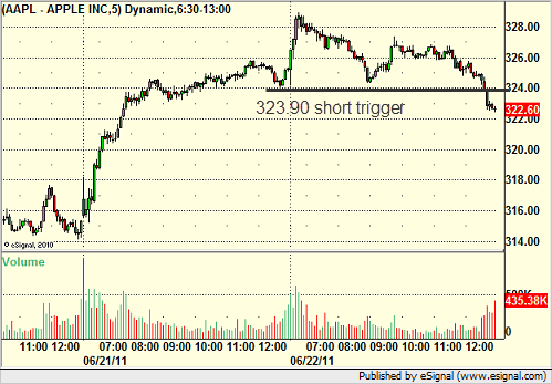 In the late day, with the market heading down, AAPL triggered short (with market support) and worked great: