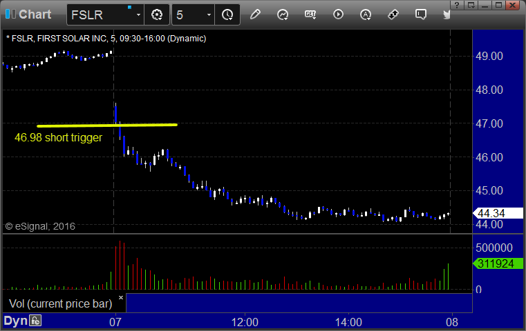 From the Messenger/Tradesight_st Twitter Feed, Rich’s FSLR triggered short (without market support) and worked great: