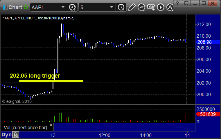 From the Messenger/Tradesight_st Twitter Feed, Rich’s AAPL triggered long (without market support due to opening 5 minutes) and worked: