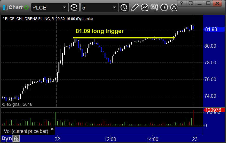 With each stock’s recap, we will include a (with market support) or (without market support) tag, designating whether the trade triggered with or without market directional support at the time. Anything in the first five minutes will be considered WITHOUT market support because market direction cannot be determined that early. ETF calls do not require market support, and are thus either winners or losers.