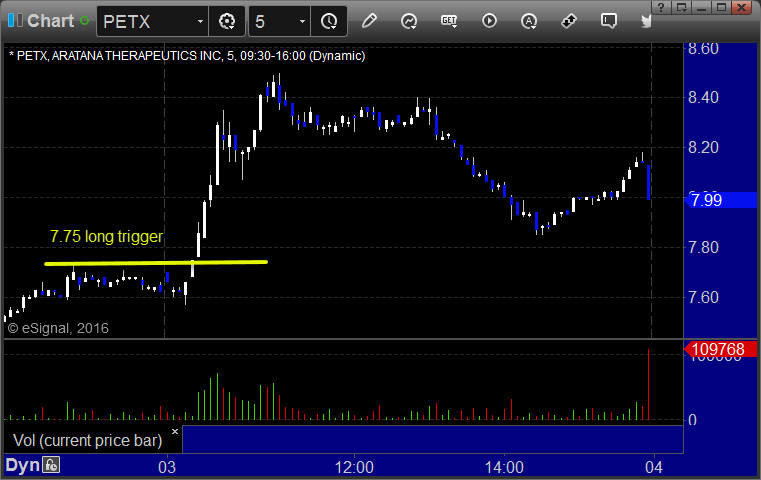 From the report, PETX triggered long (with market support) and worked great: