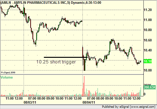 AMLN triggered short (without market support due to opening five minutes) and worked: