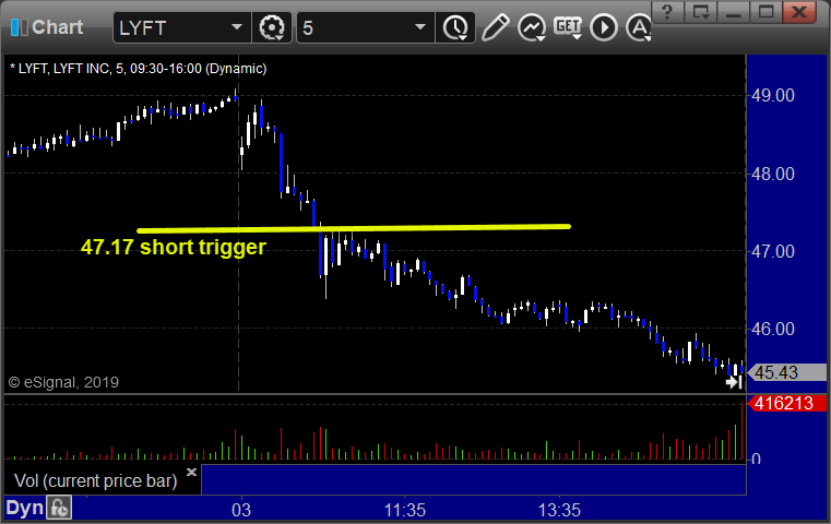 From the Messenger/Tradesight_st Twitter Feed, LYFT triggered short (with market support) and worked: