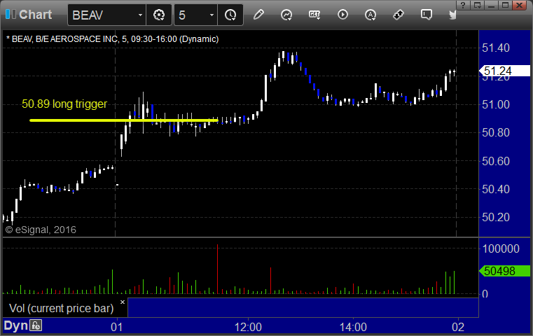 From the report, BEAV triggered long (with market support) and worked enough for a partial: