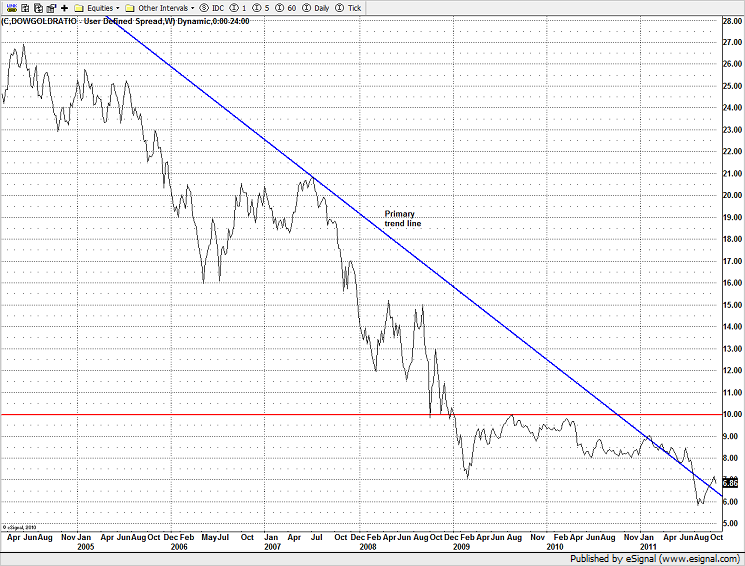 The Dow/gold ratio has yet to dicisively break the trend in favor of equities over hard assets.