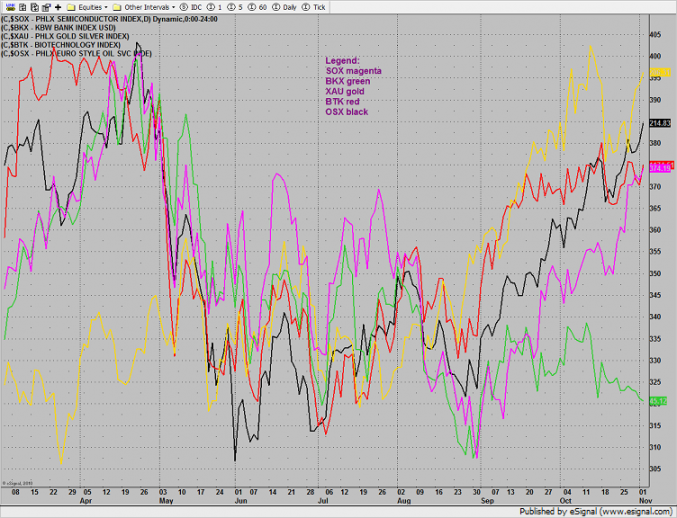 The OSX was top gun on the day, plowing new high ground. The next level that will come into play is the 2009 high just overhead.