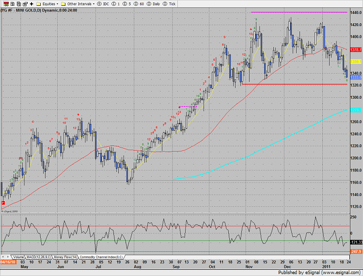 Gold is making good on the breakdown under the 1350 support level. Next support is the static trend line (red) at 1321.