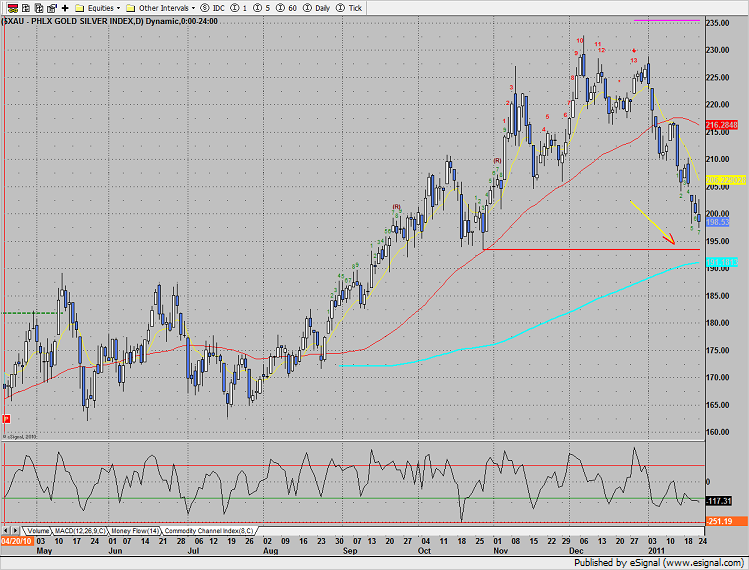 The XAU continues to be a source of funds, moving towards the suggested target around 195. Note that the chart is now 7 days down.