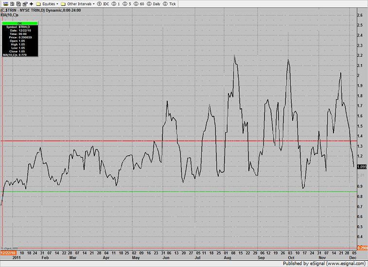 The NYSE 10-day Trin has retreated back to the neutral area. While the oversold energy has now been depleted, there is room to go before an overbought reading is recorded.