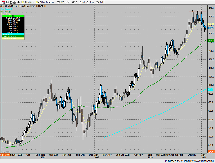 Gold was higher early in the morning but became a source of funds settling below Friday’s close. It would be highly unusual if the triple top in place did not put more pressure commodity before a lasting bottom is found. For perspective below is a weekly chart of the YG futures.