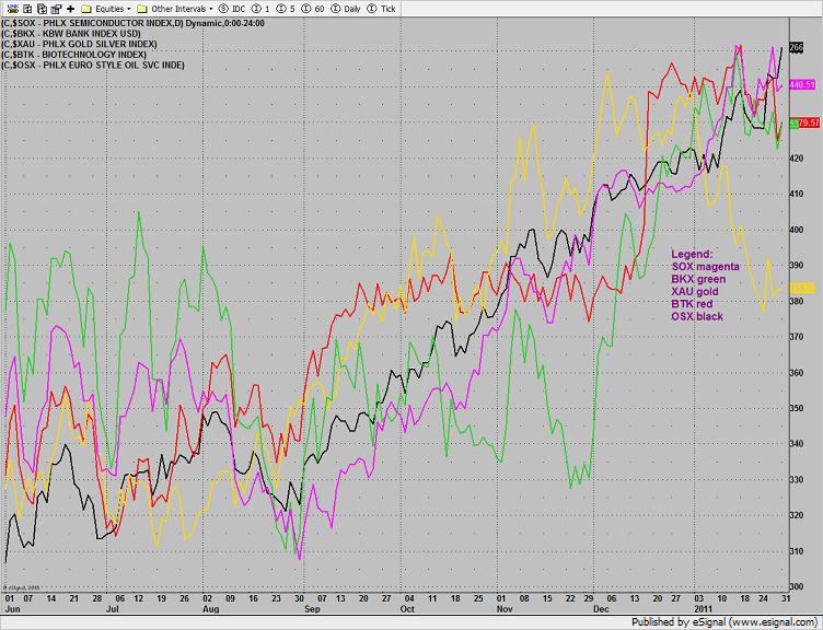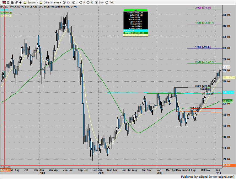 The OSX was top gun, +6 on the day. On the weekly chart below Fibonacci extensions have been added to project measured move targets.