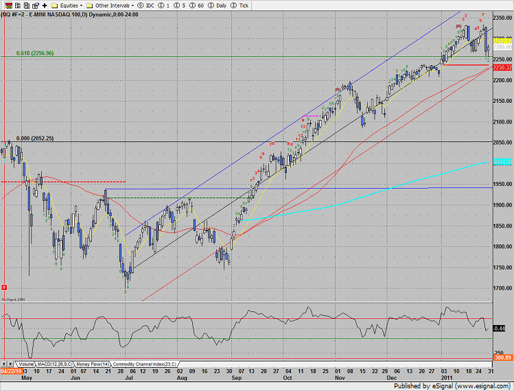 Naz also posted an inside measuring day. The key level is the 62% measured move fib which was used on Friday as the low. A settlement under this level should kick in negative momentum. Also note on the chart the important area where the 50dma, static trend line and regression channel converge.