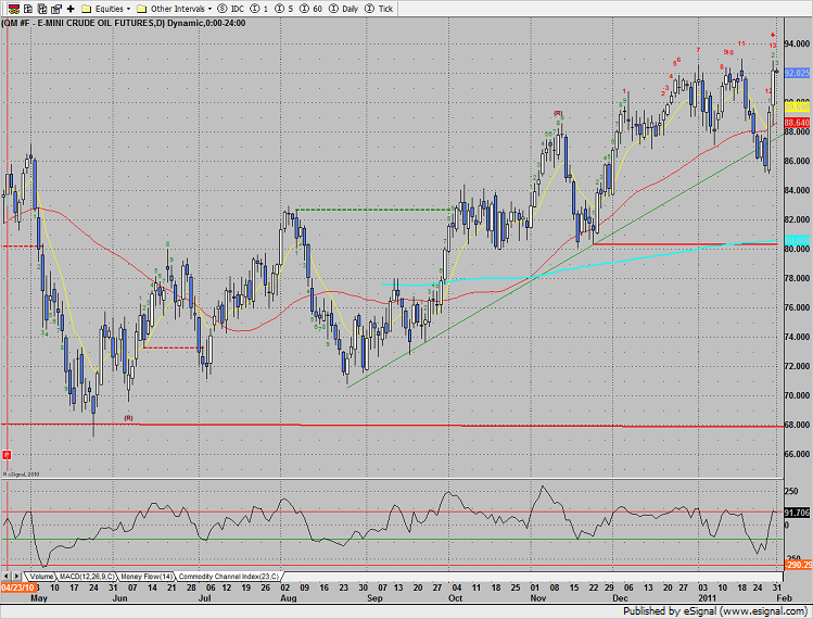 The put/call ratio printed above one which is a foot print of traders taking “risk off”, but is well short of the climatic reading seen in late Q2 2010. The chart is actually just starting to change character and curl up after the extreme “risk on” readings in late Dec and early Jan. A trend line has been applied to highlight the breakout in the 10ema over the declining DTL (blue).