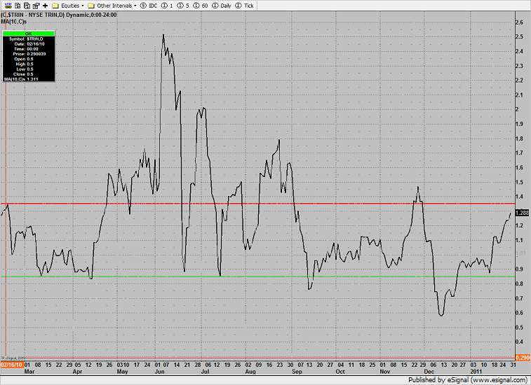 The 10-day NTSE Trin is climbing close to the 1.35 over sold threshold. The Trin is a contra indicator where lower numbers are recorded by bullish activity and higher numbers recorded by bearish trading activity.