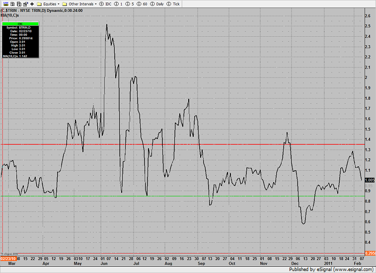 The 10-day NYSE Trin is neither over bought nor over sold at 1.00.