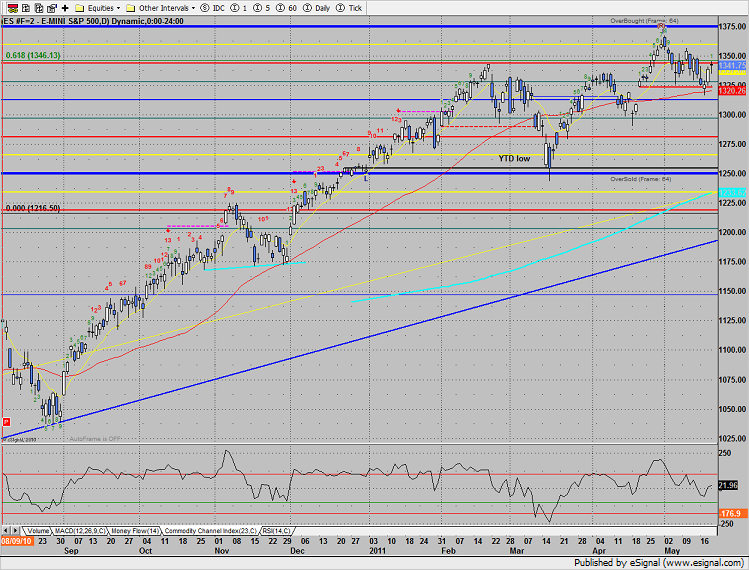 Thursday, before option expiration, the SP added 3 handles to the rebound. Note that price closed right at the February high. One key feature of the day was that a price flip was recorded and the chart now has the first day of a sell setup in place.