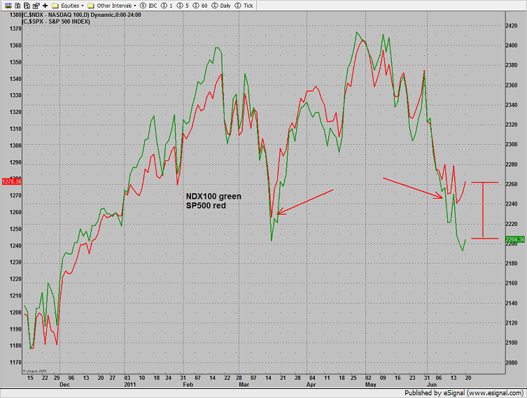Since the above condition exists it should be no surprise that the NDX is underperforming the SPX. While the Naz side broke below the March low the broad market side has not. If the NDX continues to underperform, probability suggests that the SPX will breakdown below the March low.