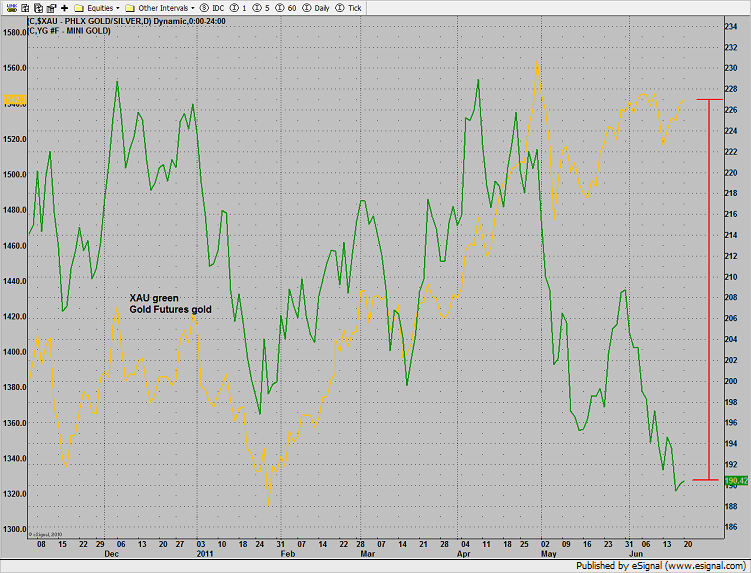 There continues to be a huge divergence between the gold futures and underlying XAU gold mining stocks. This is bearish for gold futures.