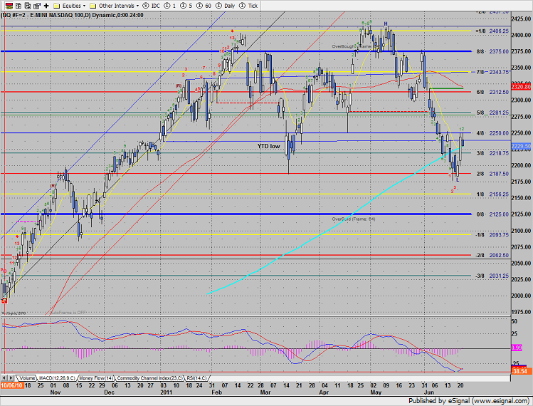 On a relative basis, the Naz was considerably stronger than the SP. Compared to the SP the Naz put in a measuring day where price held above the midpoint of the prior day’s range. Both the Naz and the SP settled right at the 10ema. 2250 is the next hurdle for the bulls.