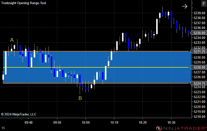 ES Opening Range Play, triggered long at A and worked, triggered short at B and did not work: