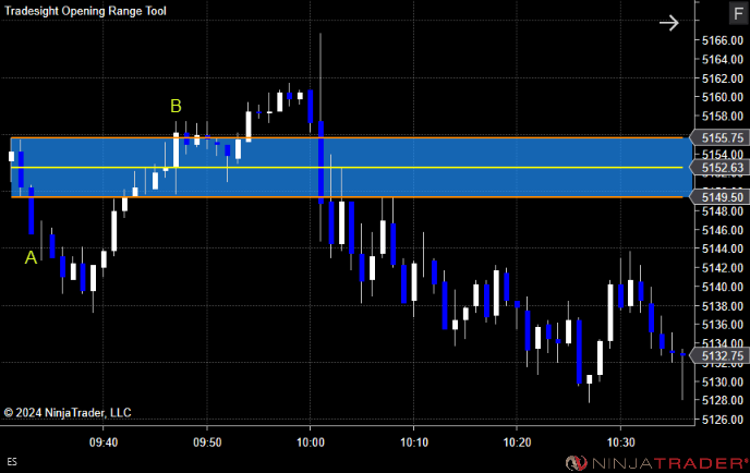 ES Opening Range Play, triggered short at A, but was too far out of range to take, triggered long at B and did not work: